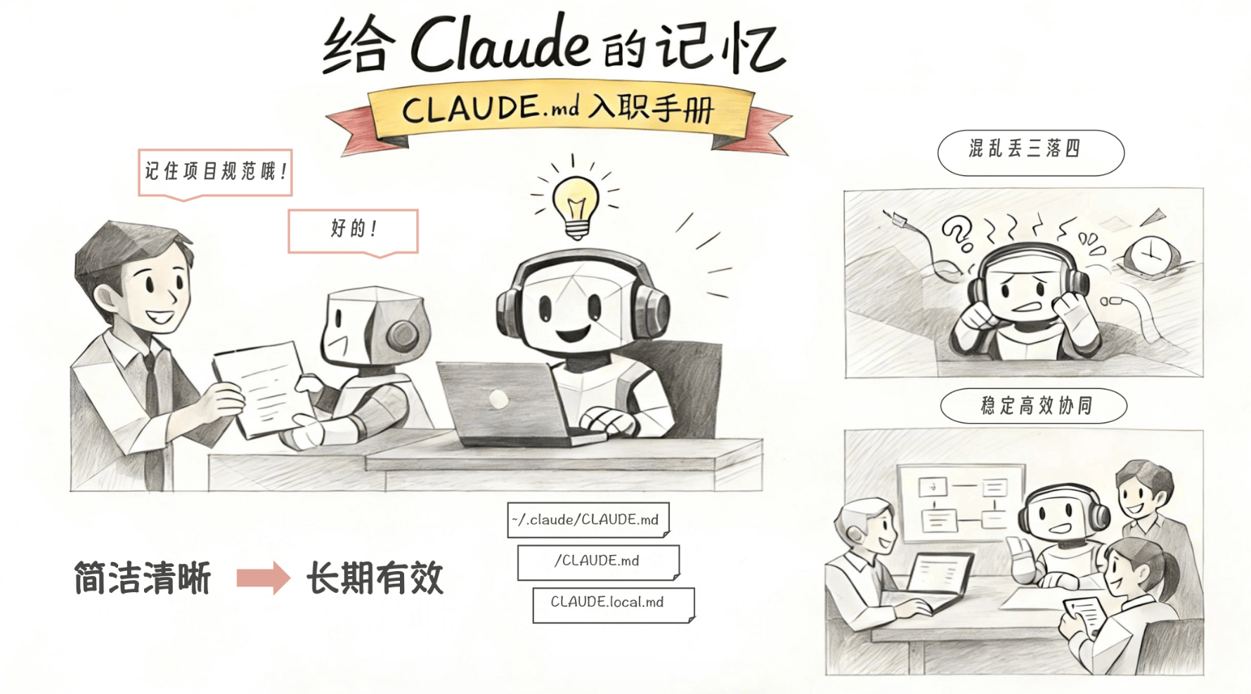 CLAUDE.md 就是治疗这种失忆症的药 — 它是一份给 Claude 的 “项目入职手册”,Claude 每次开始新对话时,就会自动阅读这份手册,了解项目背景,明确它在干活时应该遵循的一系列底层规则。
