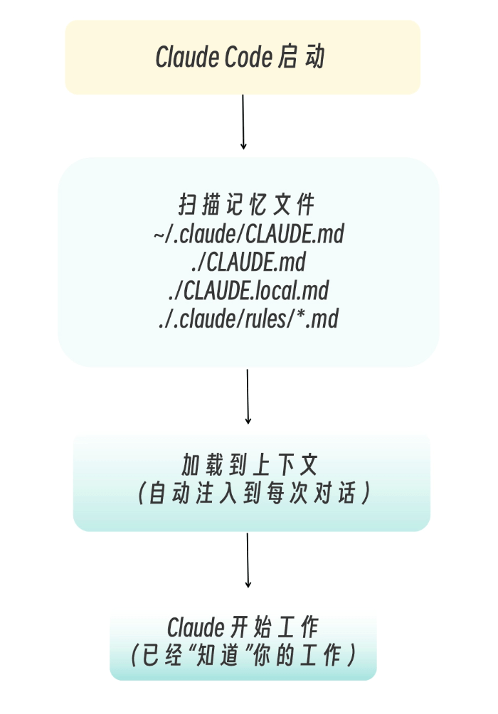 当你在项目根目录启动 Claude Code 时,发生的 “记忆系统初始化” 过程如下图所示: