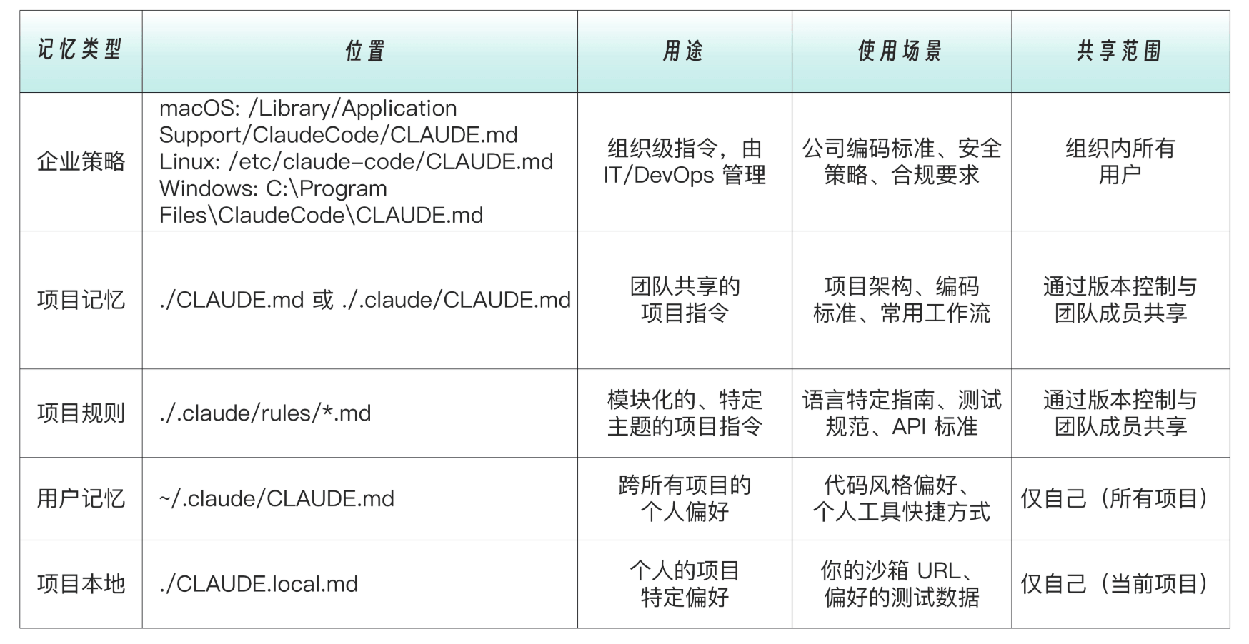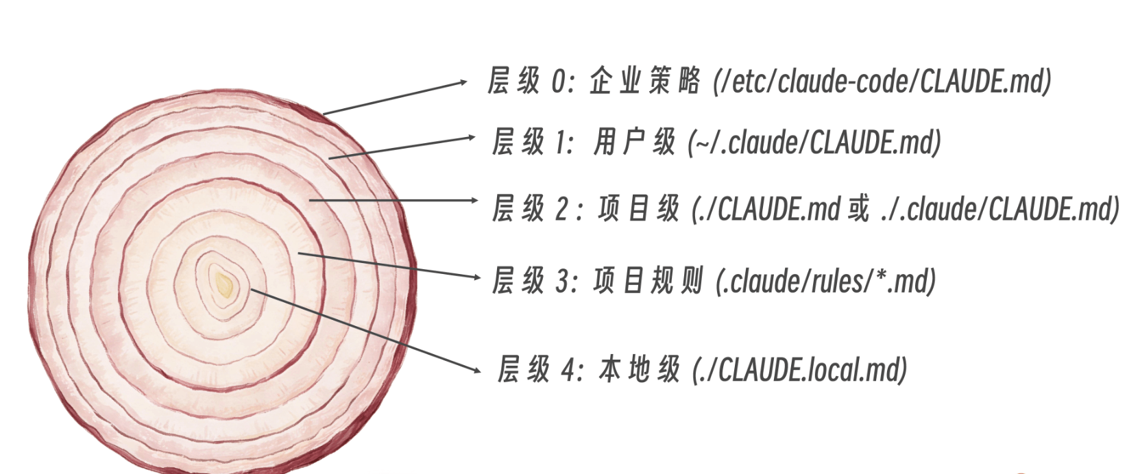 Claude 支持五个层级的记忆,就像洋葱一样,从外到内,按层级结构组织 — 高层级的文件优先加载,为底层文件提供基础。