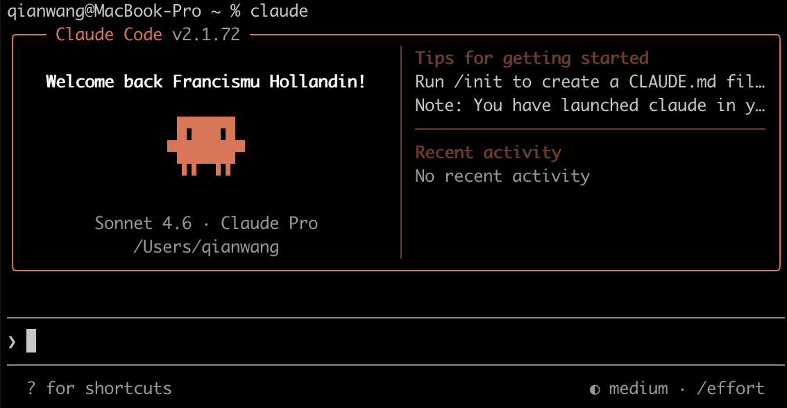 brew install --cask claude-code然后进入操作系统的命令行,输入 claude 这个命令就可以开始对话了。